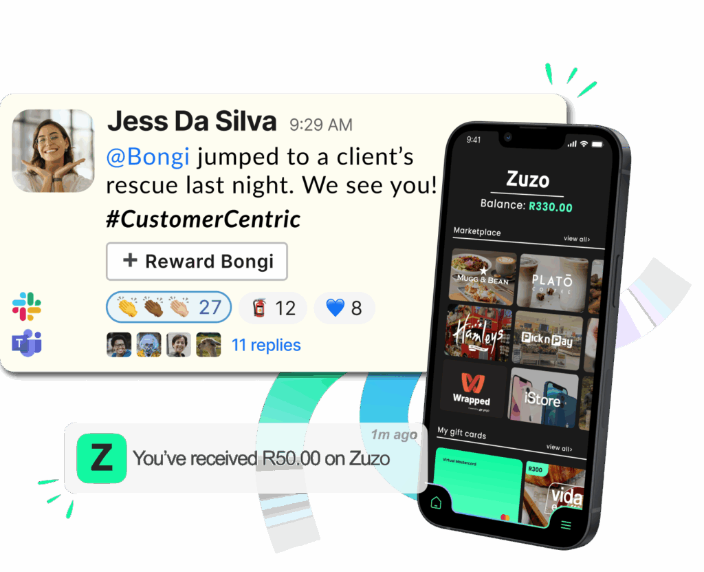 1. Peers share praise for good work and living out team values, giving a reward from their monthly budget.